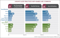 In January, the Centers for Disease Control and Prevention (CDC) published "Vital Signs: Trends and Disparities in Infant Safe Sleep Practices-United States, 2009-2015"5 using data from the CDC's Pregnancy Risk Assessment Monitoring System (PRAMS), which surveys mothers with a recent live birth two to six months after delivery. The CDC report showed that unsafe infant sleep practices were common in 2015: about one in five (22%) mothers reported not placing her infant on her or his back to sleep, more than half of mothers (61%) reported bed sharing with their infant, and nearly two in five (39%) mothers reported using soft bedding in their infant's sleep environment (see Figure 1).5 Unsafe sleep practices were most commonly reported by younger, less educated, and racial/ethnic minority mothers.
