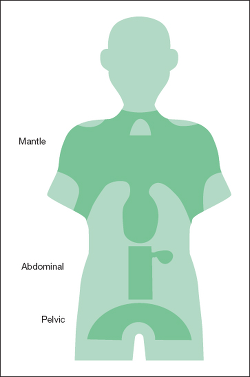High-dose radiation therapy was the mainstay of HL treatment before the 1980s. This therapy often included mantle field radiation, which delivered radiation to lymph nodes in the neck, chest, and armpits and provided limited shielding of vital organs (see Figure 1). Although this is no longer the standard of treatment, patients treated with such high-dose radiation above the diaphragm may experience subsequent primary malignancies, radiation-induced cardiovascular disease, pulmonary toxicity, and endocrine dysfunction months to years after treatment.7 In recent years, with advances in radiation treatment precision, it has become possible for clinicians to significantly reduce both the dose and field of radiation exposure.15