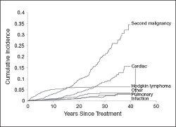 With the recognition of treatment-associated late sequelae, radiation fields have been narrowed, dosing of radiation and chemotherapy have been titrated based on patient response and disease characteristics, and new chemotherapy regimens have been developed. Even with enhanced treatment precision, HL survivors remain at risk for second primary malignancies-the leading cause of death among HL survivors-for decades after initial treatment (see Figure 2).14 A cohort study involving 3,905 HL survivors who received treatment between 1965 and 2000 found that at 30 years following treatment the cumulative incidence of a second solid cancer was 33.2%, compared with a 9.6% cumulative incidence of cancer in the general population, and at 40 years it was 48.5%, compared with 19% in the general population.3