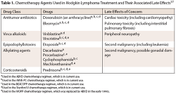 Chemotherapy. As early as the 1940s, nitrogen mustard was used to treat HL as a single-agent alkylating chemotherapy.16 Single-agent chemotherapy, however, was not successful in curing HL. Chemotherapy didn't gain acceptance until the 1970s, after the adoption of multiagent regimens that were often able to cure HL in the absence of radiation therapy.16 But as the number of chemotherapeutic agents increased, so too did the number of adverse treatment effects and long-term sequelae. As with radiation, these included subsequent primary cancers, cardiovascular disease, pulmonary toxicity, and endocrine dysfunction.16 (See Table 1.17)