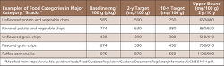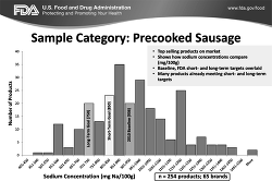 To maximize impact, the FDA is especially encouraging adoption by those food manufacturers with products that make up a sizeable proportion of national sales by category and restaurant chains that are national and regional in scope. Table 4 provides an example of some targets for 5 snack food categories. The Figure is an example provided by the FDA that illustrates baseline values of precooked sausages and delineates the 2- and 10-year targets and mean content. Some products have already achieved the 2- and 10-year targets.