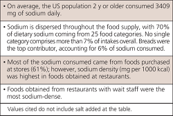 Sources of sodium in the diet of the US population are widespread throughout the food supply. Analysis of the most recent US intake data, from 2013 to 2014 What We Eat in America, the dietary intake data portion of the National Health and Nutrition Examination Survey (NHANES), reveals that on average the US population 2 years or older consumed 3409 mg of sodium daily.1 This value does not include salt added at the table. Table 1 provides information on sources of sodium in the American diet.