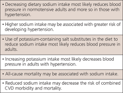 Table 3 provides the key messages summarizing the report findings. The report's coverall conclusions were "reducing sodium intake, increasing potassium intake, and using potassium-containing salt substitutes in the diet significantly decrease blood pressure, particularly among those with hypertension. Limited evidence also suggests that sodium intake is associated with risk of all-cause mortality and that reducing sodium intake may decrease the risk of CVD morbidity and mortality." The RCTs provided the best evidence demonstrating the effect of decreasing dietary sodium intake on blood pressure reduction and therefore decrease in incidence of hypertension in adults. This aligns with the finding from observational studies that found higher sodium intakes were associated with greater risk of hypertension, although findings were deemed to be a low level of evidence.