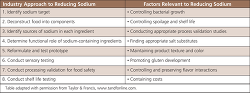 Challenges in sodium reduction remain. Table 5 provides a summary of industry approaches and factors relevant to reducing sodium, adapted from proceedings of a workshop on opportunities and challenges in sodium reduction.18 Sodium chloride (salt), the predominant source of added dietary sodium, serves many functions in foods. There is no perfect commercially viable alternative for salt. Salt helps to bring out the flavor in food, and there is a significant difference between using salt within a food compared with using it on the surface of a food. For example, in soup, salt brings out the savory flavor of chicken broth and increases the brightness of carrots. In breads, it helps to provide texture and the golden color that we associate with freshly baked bread. Other sodium salts include bicarbonate (leavening in baking), ascorbate (vitamin C source), lactate and sorbate (preservation), monosodium glutamate (umami taste), and citrate (pH regulation). All sodium salts contribute to sodium content of a food.