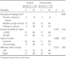All participants were of Han ethnicity. Most were men, with 92% in the control group and 84% in the intervention group. Age of participants in the control group ranged from 26 to 77 years with a mean age of 61.12 years (SD = 12.23); in the intervention group, participants' ages ranged from 24 to 79 years with a mean age of 63.00 years (SD = 13.60). Most of the participants were retirees, 80% in the control group and 84% in the intervention group. The control group had 84% participants living in an urban area, whereas the intervention group had 92% urban residents. Among participants in the control group, 56% were cared for by spouses or family members, 36% were cared for by paid care workers, and 8% did not have a nonprofessional caregiver. In the intervention group, the corresponding rates were 60%, 36%, and 4%. The period since diagnosis of stroke of the control group ranged from 1 to 4 months with a mean duration of 1.92 (SD = 0.95) months, and the period since diagnosis in the intervention group ranged from 1 to 6 months with a mean duration of 2.08 (SD = 1.15) months. Demographic and clinical characteristics of participants in both groups are shown in Table 2, and Chi-square test indicated no statistical significance between the two groups related to these characteristics (p > .05).