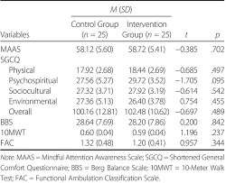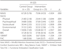 Mean baseline scores of the control group and intervention group on the MAAS, SGCQ, BBS, 10MWT, and FAC are shown in Table 3. No statistical significance on mindfulness, comfort, and ambulation ability between the two groups was detected using independent t test (p > .05).