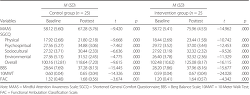Posttest scores of the MAAS, SGCQ, and each of its dimensions, BBS, 10MWT, and FAC for both the control group and the intervention group significantly improved after a 2-week observation (p < .01; Table 4). Improvement in the MAAS score of the intervention group was greater than that of the control group (p = .000). The intervention group had a greater score in overall SGCQ (p = .005), as well as a greater score in the physical (p = .004) and sociocultural (p = .006) subscales of the SGCQ than the control group. The difference between the two groups in the psychospiritual subscale, as assessed by the posttest score of SGCQ, was comparatively smaller, but the score of the intervention group significantly outweighed that of the control group (p = .026). Posttest score of SGCQ in the environmental subscale showed no difference between the two groups (p = .245). Concerning ambulation ability, no significant difference was observed between the two groups in the BBS (p = .769), 10MWT (p = .139), and FAC (p = .803) scores (Table 5).