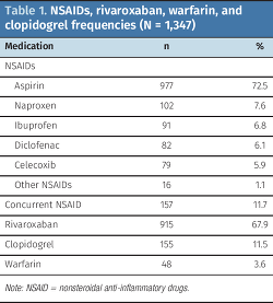 Additional variables associated with either causing or preventing GI bleeding were also extracted. The variables included use of a concurrent NSAID in addition to the primary suspect NSAID, rivaroxaban, warfarin, clopidogrel, and PPI.