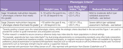 The Global Leadership Initiative on Malnutrition consensus designates weight loss, reduced BMI, and reduced muscle mass as phenotypic criteria, and reduced food intake/assimilation and disease burden/inflammation as etiologic criteria (Table 2 and Figure). The Global Leadership Initiative on Malnutrition proposes that at least 1 phenotypic criterion and 1 etiologic criterion be required for malnutrition diagnosis. Review of existing approaches used in screening and assessment served to guide selection of threshold values for the consensus diagnostic criteria and for severity grading (Table 3). Although only the phenotypic criteria are used for severity grading, the inclusion of the etiologic criteria for malnutrition diagnosis helps to identify appropriate interventions and anticipated outcomes. An etiology-based diagnosis scheme consistent with other recent guideline initiatives1,2 is endorsed by GLIM. Diagnosis options include malnutrition related to chronic disease with inflammation, chronic disease with minimal or no perceived inflammation, acute disease or injury with severe inflammation, and starvation including hunger/food shortage associated with socioeconomic or environmental factors.