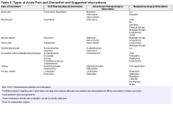 Distinguishing the type of pain the child is experiencing can be difficult and requires careful assessment of the patient as well as knowledge of the injury and procedure. Opioids should be used in combination with nonopioid medications to optimize pain control. Understanding the different types of discomfort that may lead the child to rate his or her pain at a higher level will help the practitioner better treat and manage pain in the pediatric patient. Table 3 lists types of discomfort and suggested pharmacological and nonpharmacological interventions that may be utilized. These are described in detail later.