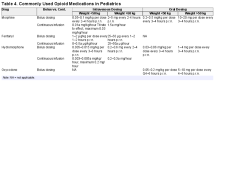 Opioids act on both central and peripheral nerve receptors. They increase the pain threshold in peripheral nerves and the spinal cord and change the brain's perception of pain. They can be given orally, intravenously, intrathecally, epidurally, and topically (Nowicki et al., 2012). The three major groups of opioids include natural derivatives of opium poppy-morphine and codeine; synthetic opioids-fentanyl, sufentanil, and meperidine; and semisynthetic opioids-hydromorphone, hydrocodone, and oxycodone (McCann & Stanitski, 2004). Table 4 lists the dosing of commonly used opioid medications in pediatrics. In children, morphine and fentanyl are most often used for intravenous pain management, whereas oxycodone, hydromorphone, and codeine are most common for oral pain management (Frizzell et al., 2017). Fentanyl has a faster onset (30 seconds) and shorter duration than morphine (30-60 minutes), so it can be a good choice for brief procedures requiring conscious sedation, in the operating room, and in the immediate postoperative period (McCann & Stanitski, 2004). Intravenous morphine also provides excellent analgesia with longer duration of action of up to 3-4 hours, so it is often used for severe breakthrough in pediatric acute musculoskeletal pain. Intravenous hydromorphone is about 10 times more potent than intravenous morphine, so it is often reserved for those patients who do not respond well or are not adequately treated with morphine.