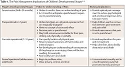 Level of cognitive development, which determines how children perceive the causes and effects of pain, may best be understood through the developmental stages defined by Jean Piaget (see Table 110, 11). For example, infants ages zero to 12 months (defined by Piaget as in the sensorimotor stage) do not understand pain, but they certainly experience it, demonstrate memory of painful experiences, and respond to parental anxiety.10 It's important that infants in this age range receive optimal pain management to prevent adverse psychological and emotional responses to future painful events. At ages two years and older, children's understanding of pain evolves.