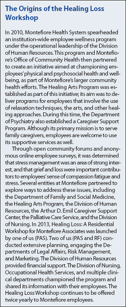 The Healing Loss Workshop. In 2013, recognition of the impact of grief and loss on hospital staff led to a joint project by several entities within Montefiore Health System, a multifacility organization based in the Bronx, New York, and affiliated with the Albert Einstein College of Medicine. The project-named Healing Loss: A Residential Workshop for Montefiore Associates-was designed as an experiential and educational program to help professional caregivers identify and work through issues related to grief and loss. Conducted twice yearly by the Division of Human Resources, the Healing Loss Workshop offers participants a safe and supportive environment in which to authentically process grief and loss related to both professional and personal experiences that have affected their lives. For more details, see The Origins of the Healing Loss Workshop.
