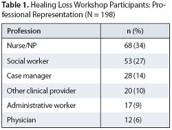 Quantitative results.Program utilization. Nine Healing Loss Workshops were held between October 2013 and October 2017, serving 198 Montefiore employees from a range of professions and departments. (Although every workshop had full registration with a waiting list, the final sample size was 198 rather than 216 because 18 people either withdrew at a point too late to fill their spots from the waiting list or didn't come on the first workshop day.) The average age of participants was 49 years (range, 21 to 67 years). Participants had worked for an average of 17 years in their profession (range, one to 63 years) and for an average of nine years at Montefiore (range, three months to 44 years). Nurses and NPs constituted the majority of participants (34%), followed by social workers (27%), case managers (14%), administrative staff (9%), physicians (6%), and professionals from other clinical specialty areas (10%) (see Table 1). The majority of participants (62%) worked for clinical departments, including oncology, palliative care, pediatrics, psychiatry, and surgery. Eight percent worked in nursing (department unspecified), 20% in case management or social service departments, and 11% in nonclinical administrative departments (see Table 2).