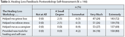 Data collection. At the close of each workshop, participants receive a written questionnaire to be answered anonymously. This feedback questionnaire consists of 14 Likert-scale and open-ended questions assessing several domains. These include overall satisfaction; perception of personal benefit related to grieving loss, relieving stress, and coping as a caregiver; whether the workshop provided new tools for healing and self-care; changes in how they felt before and after the workshop; the effectiveness of workshop staff; whether they would recommend the workshop to colleagues; suggestions for improvement; and whether they'd be interested in similar workshops at Montefiore. Participants applying for continuing education credits complete an additional questionnaire anonymously. Topics covered by that questionnaire include assessments of one's ability to recognize grieving patterns, identify grief processes and means of self-care, and integrate these elements into one's life and caregiving style; evaluation of the staff's knowledge and presentation of the subject material; and overall satisfaction with the learning experience. Participants place their completed questionnaires into envelopes that are sealed and returned to the Healing Loss program manager for entry into a secure database.