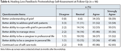 Since attending the workshop, 94% of respondents felt they had a better understanding of grief, grieving patterns, and "unfinished business," as well as how people manifest these. This had direct application to their personal and professional lives. Most respondents reported feeling more equipped to cope with loss in their personal lives (84%) and with patients (86%), and better able to carry out their caregiver role both personally (84%) and professionally (89%). A majority reported continuing to use the self-care tools taught at the workshop (89%) and felt better able to manage stress (82%) (see Table 4).