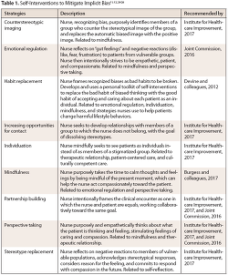 Strategies based in nursing practice.Habit replacement will seem familiar to many nurses because it's very similar to the teaching and coaching techniques we use when encouraging patients to change harmful lifestyle behaviors like smoking or eating a high-fat or high-sodium diet. And just as a single patient teaching session is unlikely to help a patient change lifestyle behaviors, Lai and colleagues found that one-time interventions to mitigate health care provider biases, though initially effective, did not change behavior over time.27 Instead, nurses can use habit-breaking strategies in conjunction with bias-mitigating strategies by employing their own personal toolkit of bias-breaking interventions.23 They can design an action plan to dissolve implicit biases with new behaviors. The plan could include the following steps: