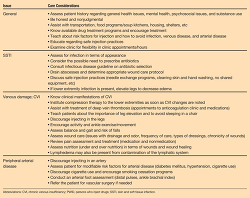 The aims of this continuing education article are to (1) explore SSTIs and vascular damage in PWIDs and (2) relate these changes to wound development and care. Some of the key aspects of care for these conditions are summarized in the Table.