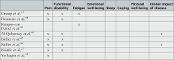 The summary of the disease domains or global dimension of the impact of disease as assessed by the included systematic reviews are presented in Table 2.