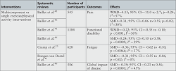 Only two systematic reviews evaluated the effectiveness of non-pharmacological and non-surgical interventions on the global impact of disease.45,46 Of these, one systematic review45 did not perform meta-analysis and showed insufficient effects/power (hydrotherapy/balneotherapy interventions). The other systematic review46 (n = 586) showed small positive effects of multicomponent or single exercise/physical activity interventions on QoL.