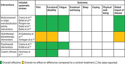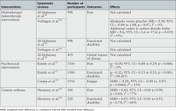 Seven systematic reviews23,27,42-46 involving 86 relevant trials evaluated the effectiveness of non-pharmacological and non-surgical interventions on pain. Two systematic reviews showed small positive effects (effect size is < 0.40) of multicomponent or single exercise/physical activity interventions42,46 (n = 545) and one did not perform meta-analysis either because it was not possible and/or because there were no statistically significant differences between the trial arms.23 Two systematic reviews showed insufficient effects/power (no statistically significant differences or the inability to provide an overall effect size) of hydrotherapy/balneotherapy interventions43,45 against usual care, exercise, mudpacks or relaxation therapy. One systematic review showed small positive effects of psychosocial interventions27 (n = 1316) and one did not perform meta-analysis for the reasons mentioned previously.23 The remaining systematic review44 (n = 340) showed moderate positive effects (effect size is > 0.40 and < 0.80) of custom orthoses.