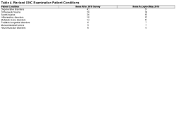 Survey results related to the ONC examination will be addressed first. ONC members of the Role Delineation Task Force determined the ONC examination specifications should continue to be organized primarily by patient conditions and content areas that define primary knowledge domains for orthopaedic RN practice. They organized the 102 task statements and 47 knowledge statements on the RDS survey into these patient conditions and content areas. With psychometric guidance, members judged a 135-item examination would be sufficient to sample examinees' mastery of knowledge in those domains. They reviewed participants' responses regarding the percentage of examination items that should be allocated to each domain and considered the mean significance ratings of knowledge statements in each domain. As subject matter experts, ONC task force members also considered the breadth of content within each knowledge area. Each member then independently identified a recommended item allocation in each area; these allocations were aggregated and present to the task force for discussion. Analysis of these results in relation to orthopaedic nursing practice led task force members to revise the number of questions for each patient condition and each content area for future forms of the ONC examination (see Tables 4 and 5). ONC examination specifications are available to candidates to use for test preparation.