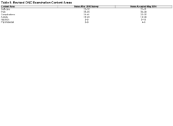 To reflect current orthopaedic practice on certification examinations, the ONCB will continue to conduct an RDS approximately every 5 years. Data from the study assist in the evaluation of current test specifications and guide any necessary changes pertinent to nursing practice for RNs and NPs. Results of the study assist task force members to develop updated examination specifications (content outline) that are made available to candidates, item writers, and any other interested individuals. Content outlines could be considered as frameworks for the examinations. The current examination specifications can be found on the ONCB website (http://www.oncb.org).