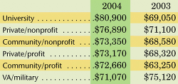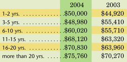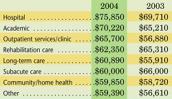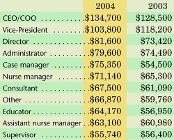 Your average salary this year is $72,080, a substantial 8.4% increase from $66,020 in 2003. This finding is significant, as these salaries rose 4.9% from 2002 to 2003. Over half of you (53.9%) earn between $60,000 and $89,999, 29.5% earn less than $60,000, and 16.4% earn greater than $90,000. Impressively, 9.6% of you earn more than $100,000 per year, up from 6% in 2003 and 5.3% in 2002. Thankfully, salaries are beginning to climb since employers are competing to recruit and retain a shrinking pool of talented nurse managers to lead staff through the worsening shortage.