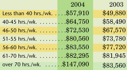 As expected, longer hours are, for the most part, proportionate to higher salaries. Those of you who work 40 to 45 hours per week earn an average of $64,750, while your colleagues who work 61 to 70 hours per week earn $82,295. (See "Salary based on work hours.")