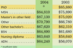 Most of you hold a baccalaureate degree (68.1%). Regarding master's degrees: About 20% of you hold an MSN and 11% of you hold a master's degree in another field, from sociology to business administration. In comparison to the 2003 survey, a larger number of you are educated at the diploma or associate degree level (27%), up from 23.5% last year. This increase most likely reflects the promotion of lesser educated nurses to fill the dire need for nurse managers. Those of you who hold a non-nursing master's degree earn the most, with an average of $87,130, followed by those of you with MSNs, at $84,810. Diploma graduates earn the lowest amount, at a yearly rate of $63,640. (See "Education by average salary.")