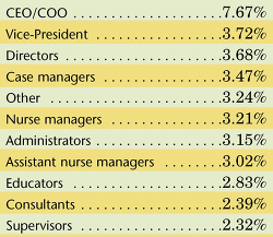 Naturally, those of you who earn the most are CEOs and have been in nursing the longest number of years. You're also 56 to 60 years old, hold a non-nursing master's degree or have advanced certification, work in a university hospital or health system with more than 700 beds, live in the Pacific region, and work more than 70 hours per week. Sound daunting? Whether or not you fit into any of these categories, review the following results to see how your salary compares to others across the global community of nurse leaders.