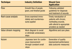 At Toyota Motor Corporation, any employee can stop the assembly line when a serious problem is noted. This concept has been applied recently to health care. 7 Toyota has identified 4 key techniques in their program: flow, root-cause analysis, value stream mapping, and kaizen. Table 1 defines these terms and suggest how they can be applied to wound care.