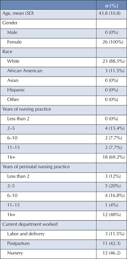 A total of 26 female registered professional nurses participated in the intervention and completed pre- and postmeasurement surveys (see Table 1). Nurses ranged in age from 24 to 66 years, with a mean of 43.8. The average number of years of nursing practice and perinatal nursing practice was 41 and 30, respectively. The ethnic makeup of the sample was 88.5% Caucasian and 11.5% African American. The sample consisted of perinatal nurses from the three departments within the Women's Services Unit, labor and delivery (11.5%), postpartum (42.3%), and nursery (46.2%).