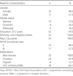 Thirty-five individuals were consented. Scores on the Mini-Mental State Examination for the 33 randomized (two spouses allocated to same group; not included in analysis) were mostly in the upper range (10 with a score of 29 and 12 with a score of 30). The sample was 54.5% male, with a mean age of 79.36 years (range 68-90) and 100% Caucasian. Education ranged from 11 to 23 years, with a high school education as the most predominant (27.3%). Thirty-one reported being retired, with three working part time. Nineteen (57.6%) were married, 24.2% were divorced, and 18.2% were widowed (see Table 1).
