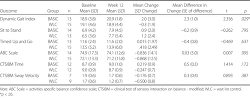Independent t tests indicated significant change (p = .029) in DGI between groups during the first 12 weeks (see Table 2 for details), with a large effect size (.92). A medium effect was found for both MCTSIB time (.63) and sway velocity (.40). When the groups were combined (data from WLC group during intervention phase [Weeks 13-24] with that from the first 12-week period for the BASIC group) for analysis, DGI was the only outcome approaching significance (p = .068) and had a medium effect size (.38). In the analysis to test whether change was sustained from the end of the intervention (12 weeks) to follow up at 24 weeks, the DGI showed significant decline (p = .042; see Table 3). There was essentially no change in the TUG Test and sway velocity at 24 weeks. The other outcomes also declined, showing small to medium effects (ABC effect size = .18, STS Test = .38, MCTSIB Test = .40, and DGI = .70) for decline from the 12-week data.