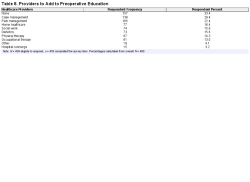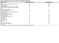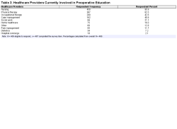 There were 260 (55.4%) participants who identified at least one additional provider they wanted to add to the preoperative education team. Respondents most commonly identified that they would like to add case management as an additional provider to their current preoperative education team (n = 138; 29.4%), followed by pain management (n = 105; 22.4%). A few participants (n = 19; 4.1%) responded "other" to this question item, identifying providers such as anesthetist, pharmacist, and diabetes educator. Although many professionals were identified as important to add to the current preoperative education team, 157 (33.5%) respondents felt that they did not need to add any additional providers. See Table 8 for response frequency.