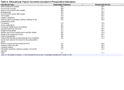 How to prepare for surgery was most frequently included as an educational topic for preoperative education (n = 466; 99.4%), followed by the recovery process (n = 460; 98.1%) and what to expect while in the hospital (n = 458; 97.7%). See Table 4 for frequency of participants' responses for all content areas.