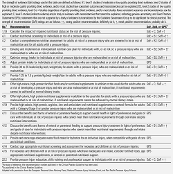 ABSTRACT: Macro- and micronutrients are required by each organ system in specific amounts to promote the growth, development, maintenance, and repair of body tissues. Specifically, nutrition plays an important role in the prevention and treatment of pressure injuries. The purpose of this manuscript is to review the nutrition-related recommendations presented in the 2019 European Pressure Ulcer Advisory Panel, National Pressure Injury Advisory Panel, and Pan Pacific Pressure Injury Alliance Prevention and Treatment of Pressure Ulcers/Injuries: Clinical Practice Guideline. Nutrition for pressure injury management is discussed in the context of the recommendations.