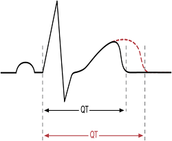 Torsade can result from inherited condition called long QT syndrome (LQTS), and of importance in the practice of pharmaceutical medicine, it can also be drug induced by a wide range of drugs and drug classes. In both cases, Torsade is associated with prolongation of the QT interval, the time between the onset of the QRS complex and the offset of the T wave, as seen on the surface ECG. Figure 2 presents a stylistic representation of the QT interval and QT-interval prolongation. For each cardiac cycle, ventricular depolarization is reflected in the QRS waveform, whereas ventricular repolarization is reflected in the T wave. Delayed ventricular repolarization is manifest as prolongation of the QT interval (Turner et al., 2018).