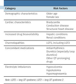 When considering the use of medications that carry a Prescribing Information warning of proarrhythmic potential, providers must consider individual patient risk (or risks) for developing QT prolongation and the potential for Torsades. When prescribing such medications, health care providers must understand that these risks are influenced by biological factors including advanced age and female sex, current clinical characteristics including hypocalcemia, hypokalemia, and hypomagnesemia, structural heart disease, and/or conduction irregularities that affect normal cardiac electrophysiology, as well as concomitant medications that might also potentially prolong the QT interval. It is important that physician assistants, nurse practitioners, and indeed all health care providers are aware of all these considerations, as optional medication treatments may be few or impractical. In addition, despite the potential for QT prolongation among certain medications, judicious use is often appropriate and necessary based on the potential therapeutic benefits of these drugs.
