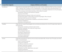 CredibleMeds (Woosley, Black, Heise, & Romero, 2018) maintains a list of drugs known to prolong QTc. To assess the risk of harm from medicines scientifically, this organization has developed a risk-stratification process, the Adverse Drug Event Causality Analysis, that includes monitoring and analysis of multiple related sources to yield a list of several hundred drugs of interest (Woosley et al., 2017). This list is divided into categories based on a drug's likelihood to cause QTc prolongation or Torsade. List 3 contains those with a conditional risk; list 2 contains those with a possible risk; and list 1 contains drugs with a known risk of Torsade. Examples are provided in Table 2.