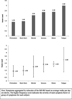 Symptoms aggregated by subscales of the MS-RS, along with average walks per day, are shown in Figure 2. These analyses revealed motor symptom of leg weakness (mean = 3.3, SD = 1.1); urinary, sensory (numbness), and fatigue were reported at higher frequencies in three participants (Participants 3, 4, and 6). The higher score indicates the severity of each symptom factor or group of symptoms for each subject.
