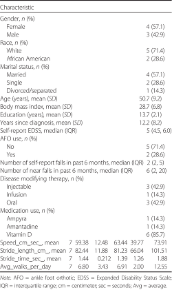 A total of seven subjects with MS agreed to participate in this study. Descriptive statistics for demographic and disease-related variables, symptoms, and gait parameters from depth sensors are presented in Table 1. Participants were predominately White, non-Hispanic, female, and married. Participants tended to be highly educated, with the majority completing at least some college. Disease duration averaged 12 years, with the majority reporting SR-EDSS within intermediate disability range and a diagnosis of relapsing-remitting MS.