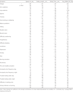 The mean scores for the 26 symptoms within the subscales on the MS-RS that correlate with gait parameters of stride/speed/walks per day are presented in Table 2. These data show a negative correlation between increased numbness sensory symptoms and both decreased walking speed (p = .04) and decreased stride length (p = .04). Mental symptoms of depression and anxiety together with the motor symptom knee collapsing was negatively related to average walks per day (p = .01, .02, .04), respectively. However, positive correlations were shown between the brain stem symptom and sleep difficulty, along with the elimination difficulties of time spent toileting during the day and initiating urination, with increased average walks per day (p = .02, .01, -03), respectively.