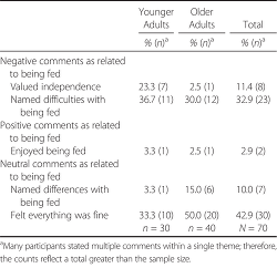 Five specific themes were identified within the three overarching sentiments associated with feeding assistance (see Table 3). Negative comments subdivided into two themes, one related to independence and the other related to difficulties associated with being fed. Overall, both younger and older adults described many difficulties encountered while being fed as compared to self-feeding that frequently related to decreased naturalness and coordination (e.g., "I just, like, know my own speed of how to angle my glass[horizontal ellipsis]it wasn't as natural"; "I didn't know if I was supposed to drink all of it or when to stop[horizontal ellipsis]"; "It made it more difficult[horizontal ellipsis]because you had to kinda move [your mouth] differently than you do normally"). These often stemmed from differences between how they would normally feed themselves or "want to be fed" and how they were actually fed (e.g., "You had to do something different than how you prefer"). However, younger adults were more likely than older adults to discuss independence, commenting on how dependency was difficult (e.g., "I don't think I can ever be dependent on somebody"; "I wasn't really in control") and how it evoked negative emotions (e.g., "I felt like an infant").