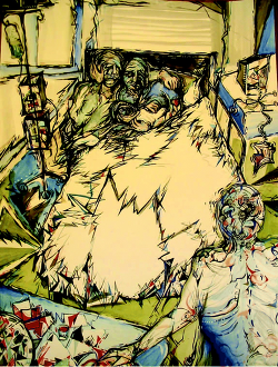 Loss, one of a series of watercolors inspired by the artist's work at the center, is the one she felt "most compelled" to paint. She explains, "I used discomfiting colors and sharp lines to convey the intense grief and lost hopes that accompany the loss of a newborn. The medical equipment stands off to the side, useless. The father gasps, and the tired, stunned mother can barely look at her lifeless child. The nurse, quietly backing the delivery table away, bears witness to their unbearable loss." The painting is another way of bearing witness to "human life and its brief, fragile, intimate bonds."