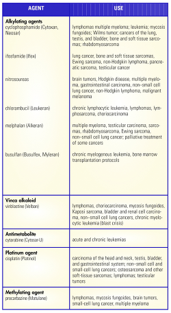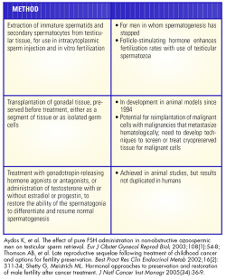The effect of chemotherapy and radiation on male fertility seems to involve both destruction of stem cell spermatogonia (stem cells that give rise to spermatocytes) and arrest of spermatogenesis (the process in which immature spermatogonia become spermatocytes and then transform into spermatozoa). 32 Factors affecting fertility include drugs, dosages, age at treatment, duration of treatment, and type of malignancy. Table 1 (page 67) lists chemotherapeutic agents that have been implicated in male infertility and the types of cancer for which they are used. It should be noted that long-term effects on fertility have not been studied for newer therapies such as imatinib (Gleevec) and gefitinib (Iressa), which target specific molecules involved in the development and progression of cancer cells, and for biologic agents such as interferons, inter-leukins, and monoclonal antibodies.