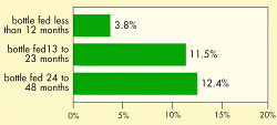 In Mexican American children the prevalence of iron deficiency was 18.5% in those who were bottle fed longer than 12 months. This is significant because 36.8% of the Mexican American children in this study were still bottle fed between the ages of 24 and 48 months, compared with 16.9% of whites and 13.8% of blacks.