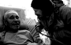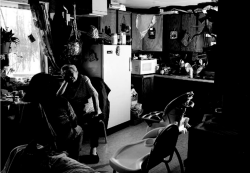 The photos on this page are of Lena Morris (seated in her kitchen), a Yup'ik living in the Yukon Delta village of Aniak, with Sue Hoeldt, her home care nurse, and Antone Anvil (sitting up in bed) and Pekar. There are no records of Lena Morris's birth, but she believes she's 90. She stays indoors, but longs to go outside and hopes the end of a long winter will make this possible. It is a hope shared by Hoeldt, who regularly visits Ms. Morris. They talk about the fiddle dance, a traditional, all-night Yup'ik celebration.