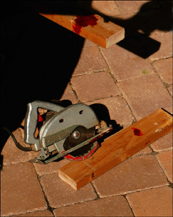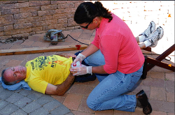 If the victim is alert, tell him to cover the wound with clean, dry material and apply firm pressure while you put on protective gear. If bleeding is severe or he's feeling light-headed, have him lie down and elevate his feet to increase blood pressure. (Act to preserve the amputated part only after the bleeding is controlled.) Take necessary actions to protect yourself from injury, such as turning off dangerous machinery. Direct someone to call 911, then intervene as follows.